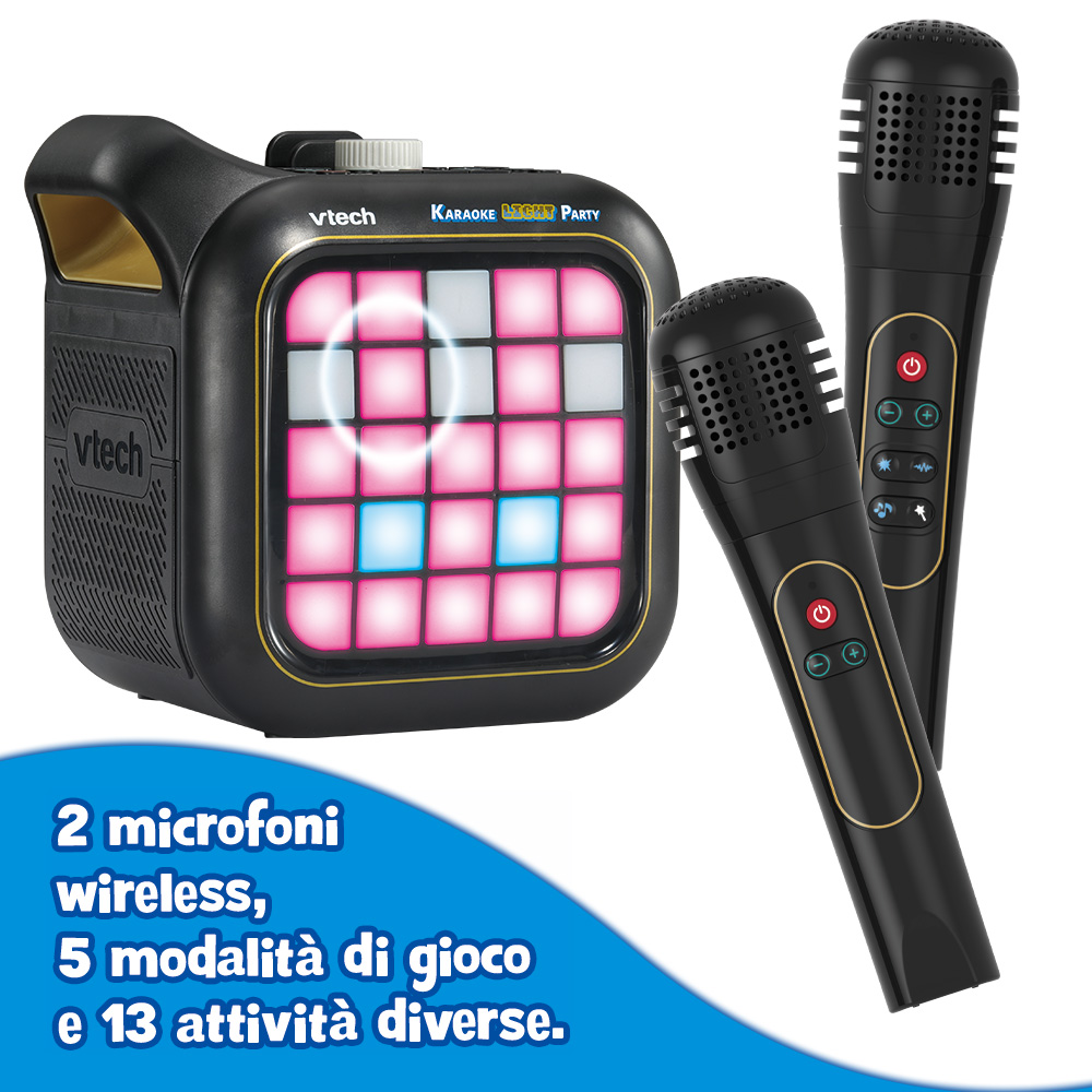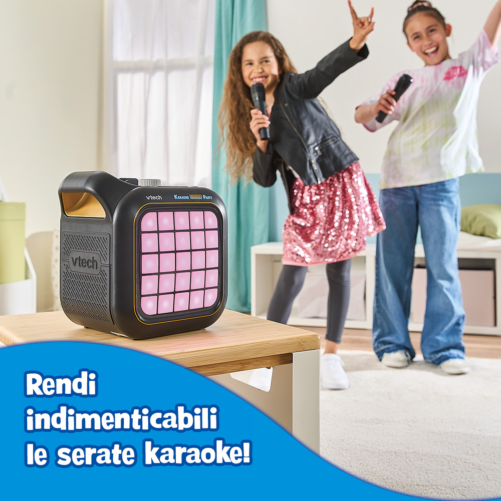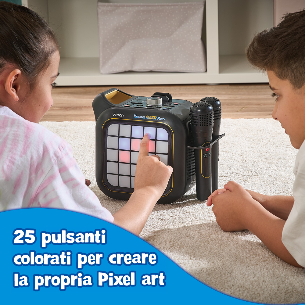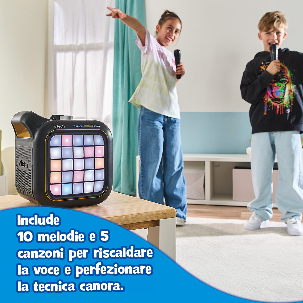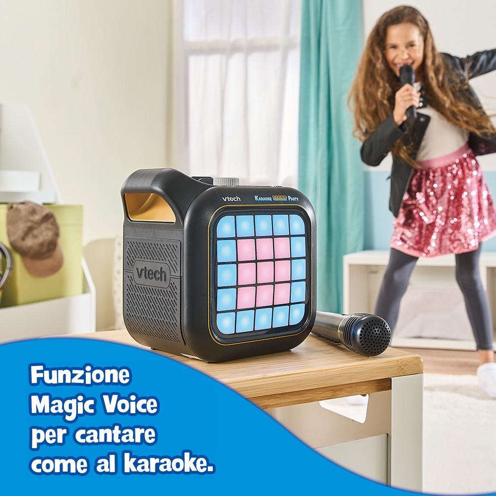 Dotato di 2 microfoni wireless, oltre 15 canzoni e melodie integrate, 6 effetti vocali, connessione Bluetooth®, luci animate e persino uno spazio creativo Pixel Art luminoso. Il tutto racchiuso in un design resistente con maniglia integrata per portarlo ovunque.