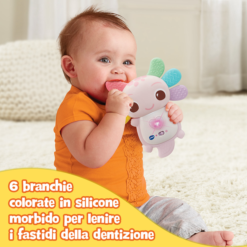 • Con le sue sei branchie colorate in silicone morbido, questo simpatico axolotl è perfetto per lenire i fastidi della dentizione e stimolare i sensi del bambino.