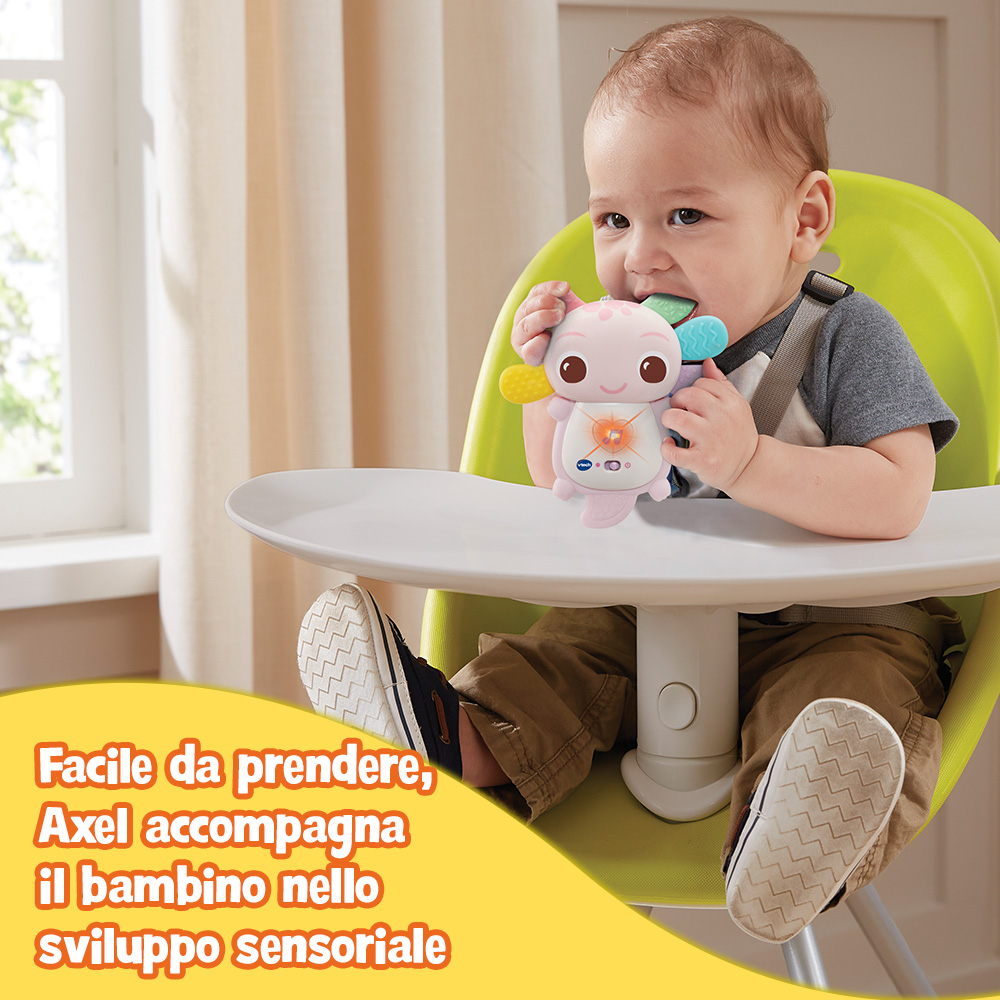 • Facile da afferrare e maneggiare, Axel accompagna il bambino nello sviluppo sensoriale, uditivo ed emotivo fin dalle prime esplorazioni.