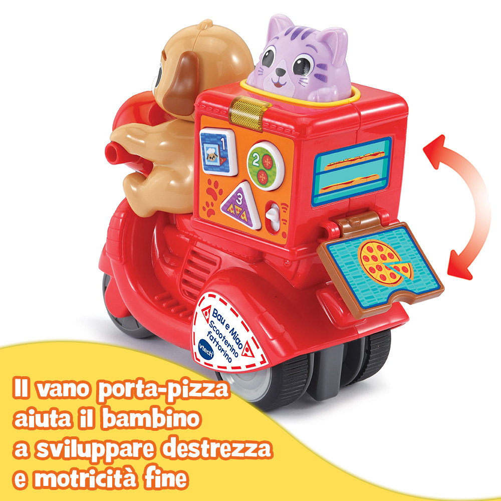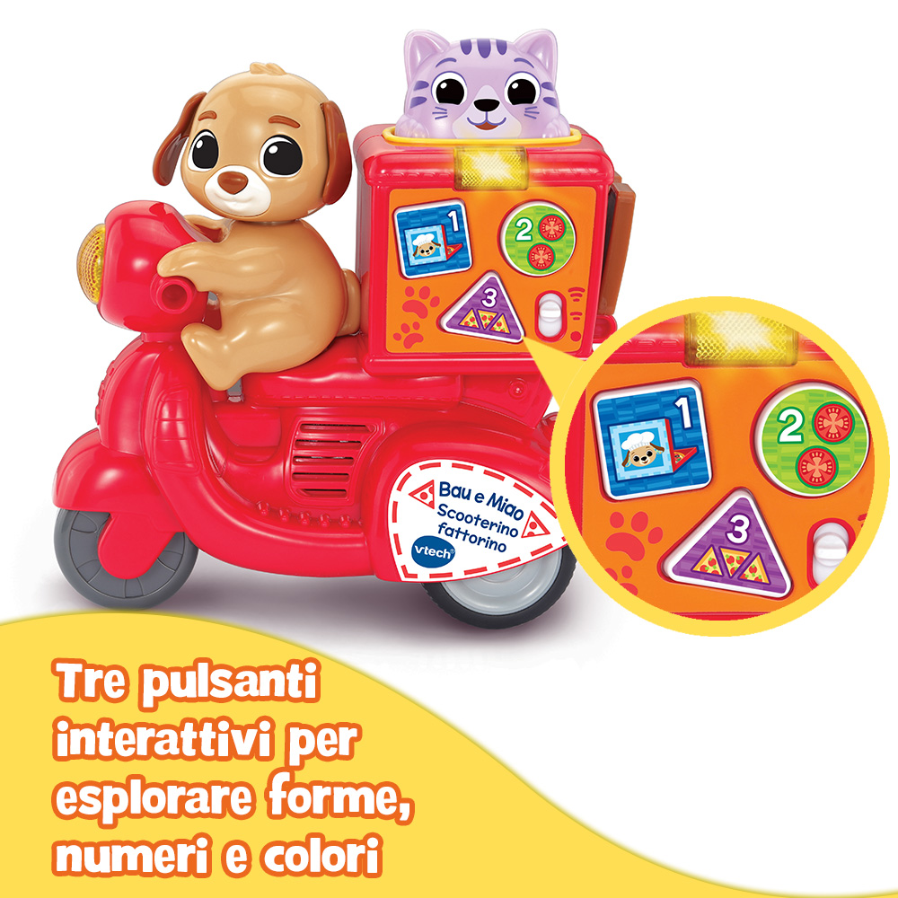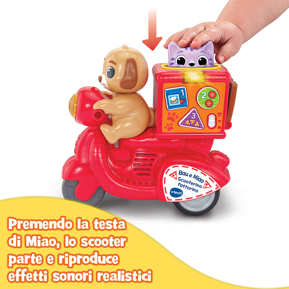 Premere la testa di Miao per far partire lo scooter aiuta il tuo bambino a comprendere la relazione causa-effetto.