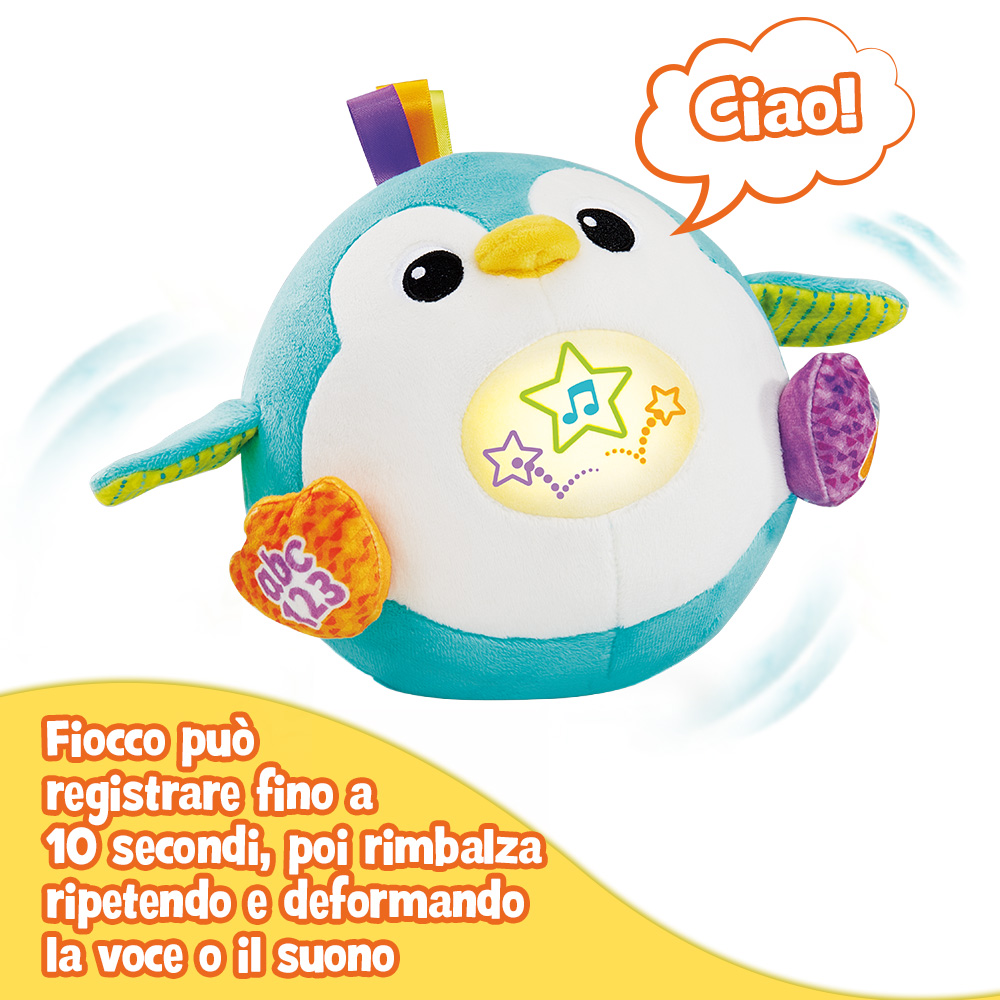 • Per divertirsi ancora di più, il pinguino può registrare fino a 10 secondi di voce o suoni, poi rimbalza ripetendo e deformando la voce per un effetto comico e coinvolgente.