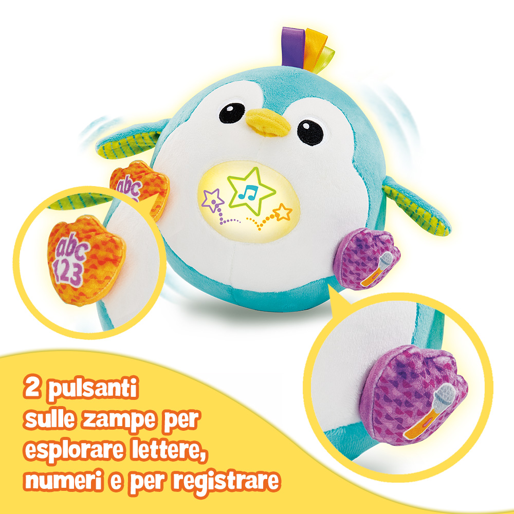 • Questo morbido pinguino in peluche incoraggia il bambino a muoversi, esplorare e interagire grazie alle sue funzioni dinamiche e sensoriali.