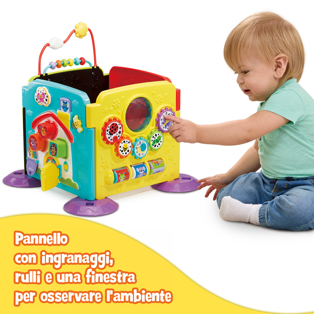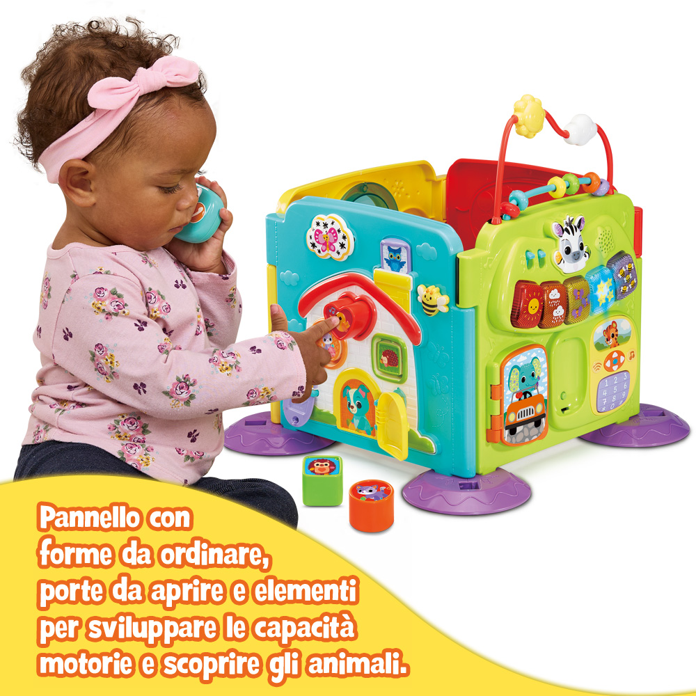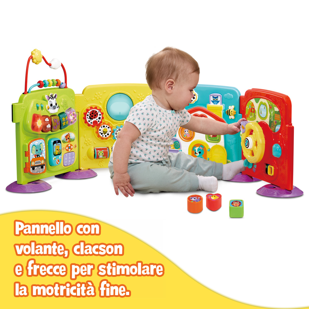 4 modalità di gioco! Con le sue configurazioni versatili (cubo, zigzag, semicerchio o pannelli indipendenti), offre grande libertà di gioco. Il bambino esplora numeri, colori, forme e animali attraverso pulsanti luminosi, un libro interattivo, un telefono, un volante, un gioco di incastri, ingranaggi e molto altro.