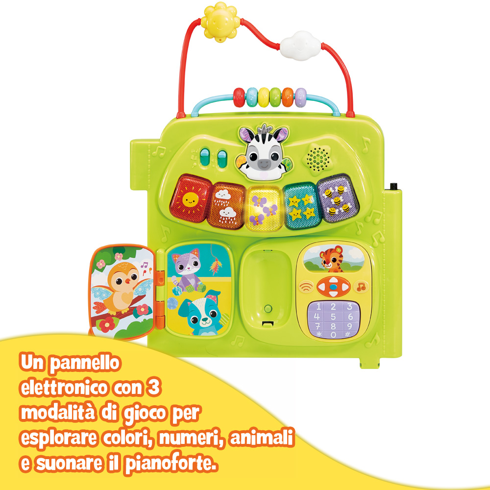 Pannello elettronico interattivo con pianoforte luminoso, libro da sfogliare, telefono removibile e tastierino numerico.
