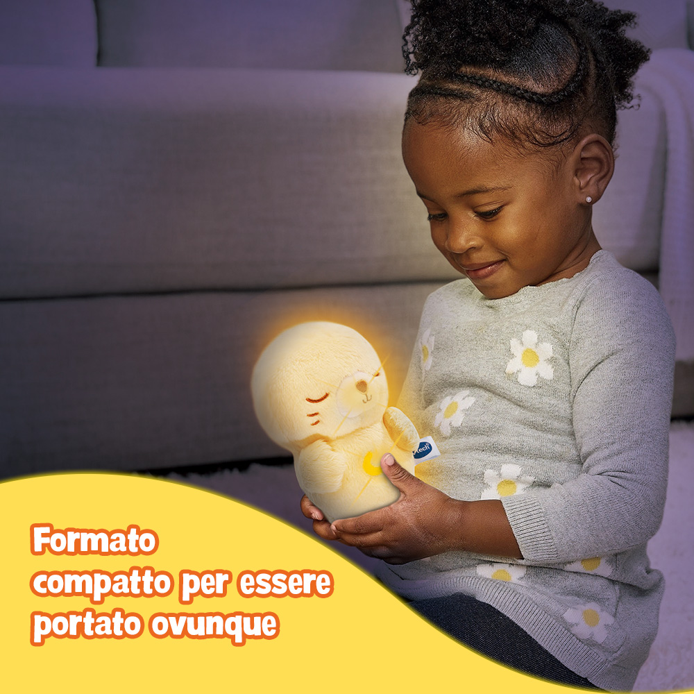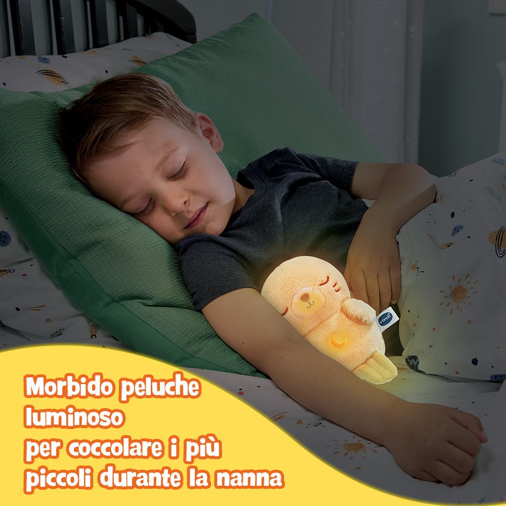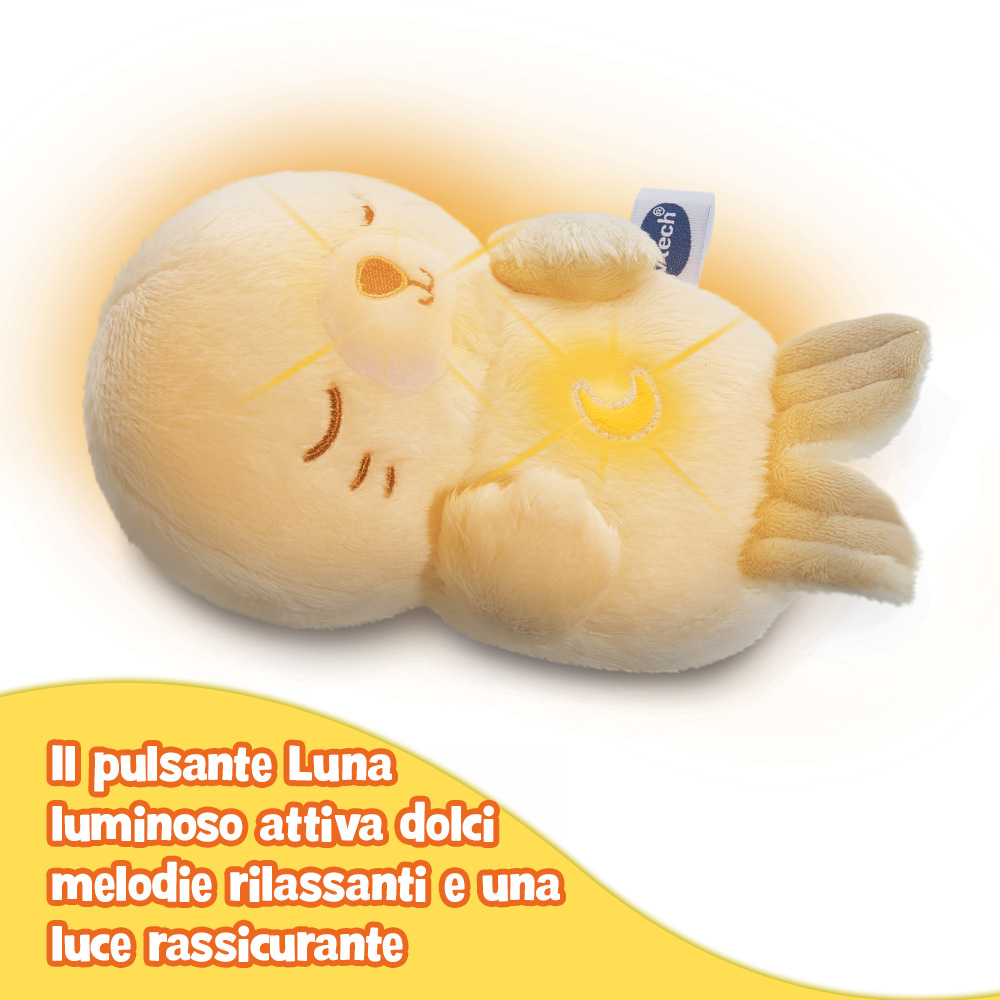 • Il pulsante Luna luminoso attiva dolci melodie rilassanti e una luce rassicurante che si diffonde all’interno del peluche, creando un’atmosfera calma e serena.