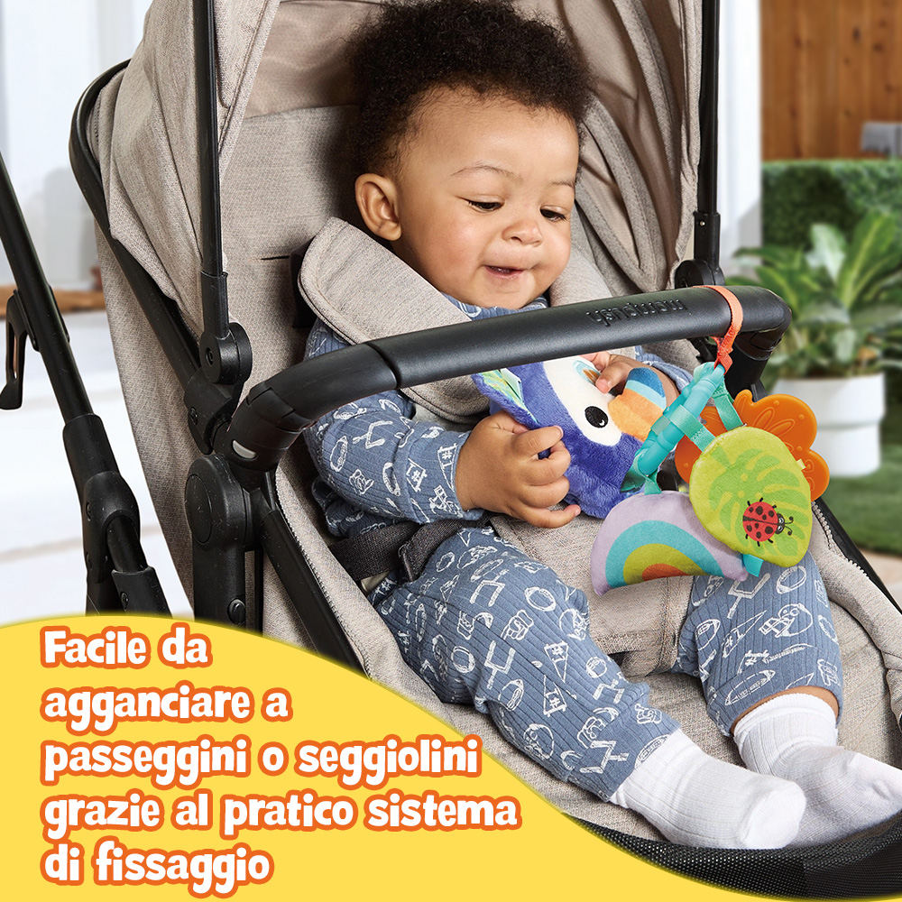 • Un soffice compagno d’avventure, pensato per stimolare i sensi del bambino a casa o in movimento. Facile da agganciare a passeggini o seggiolini grazie al pratico sistema di fissaggio.