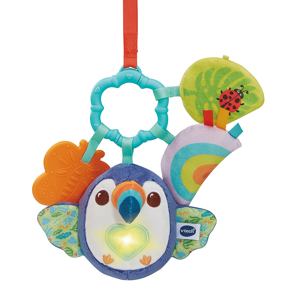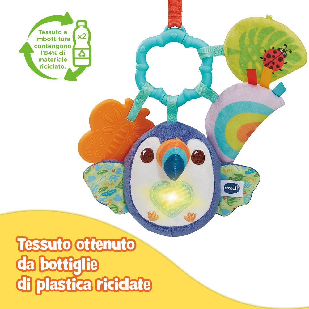 Un simpatico tucano colorato e luminoso per stimolare i sensi e l'immaginazione, da portare sempre con sé!