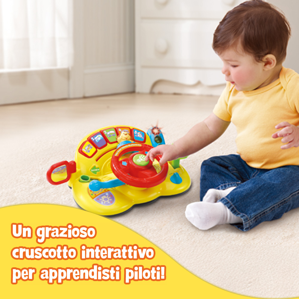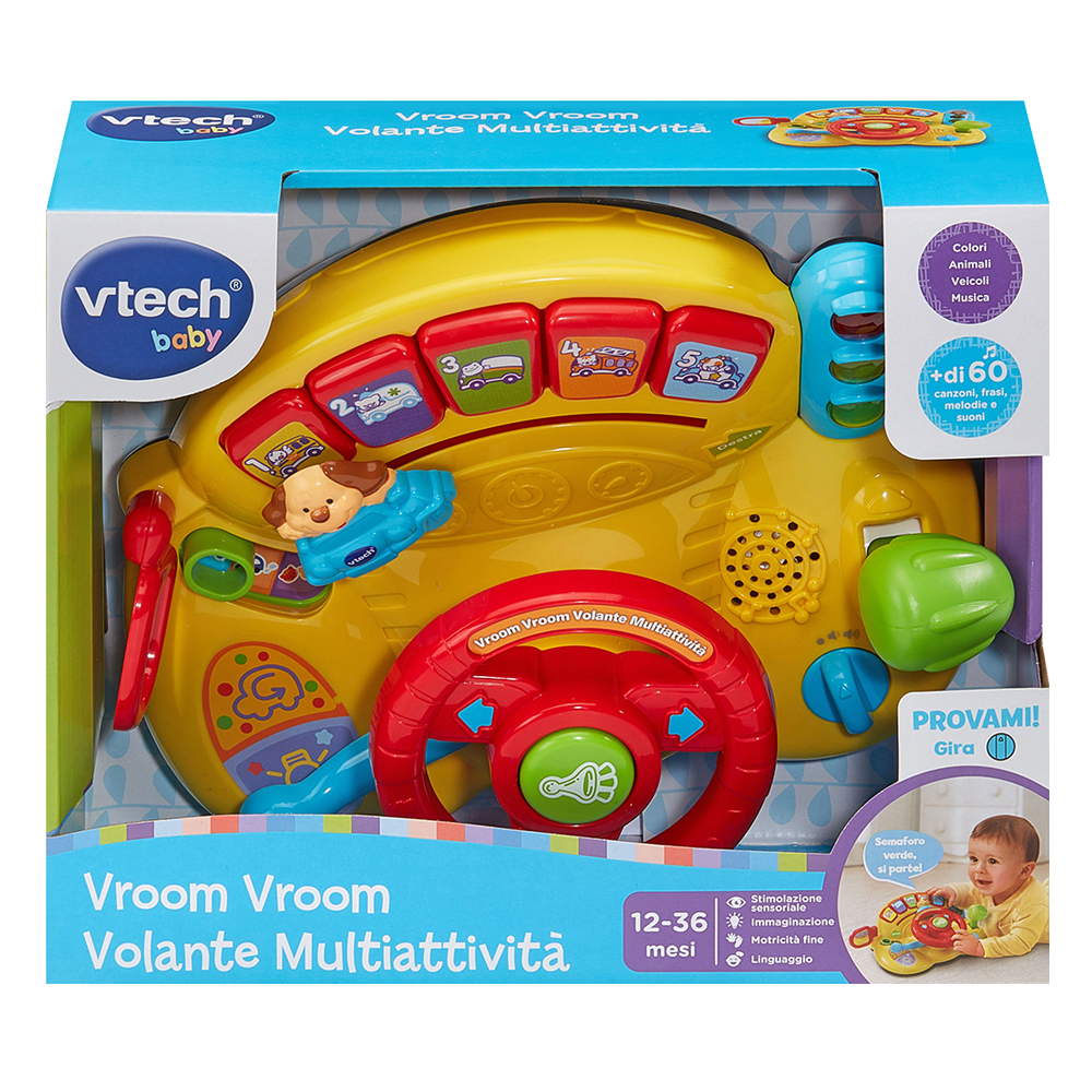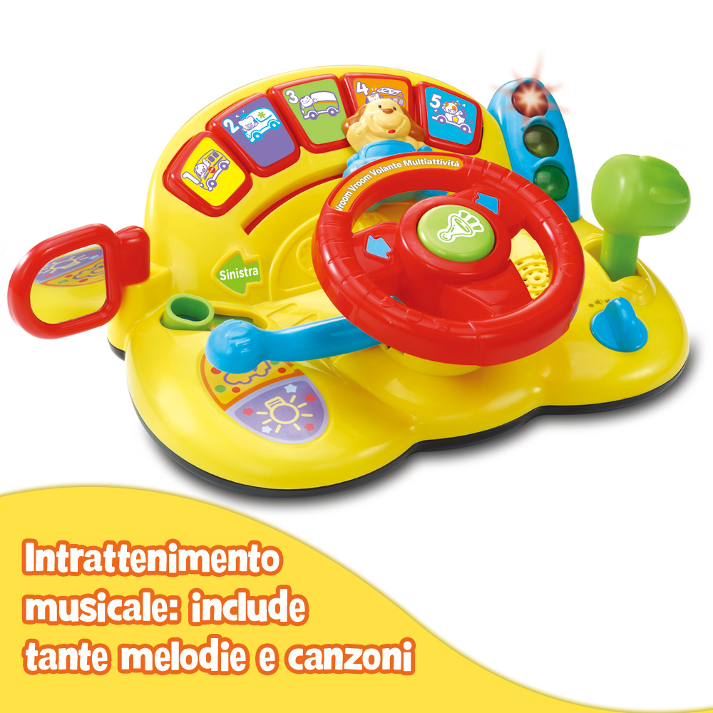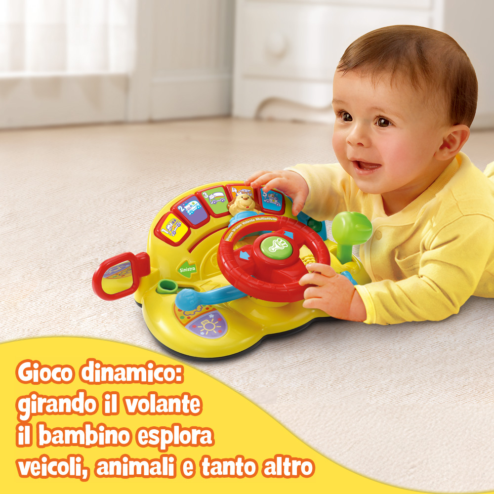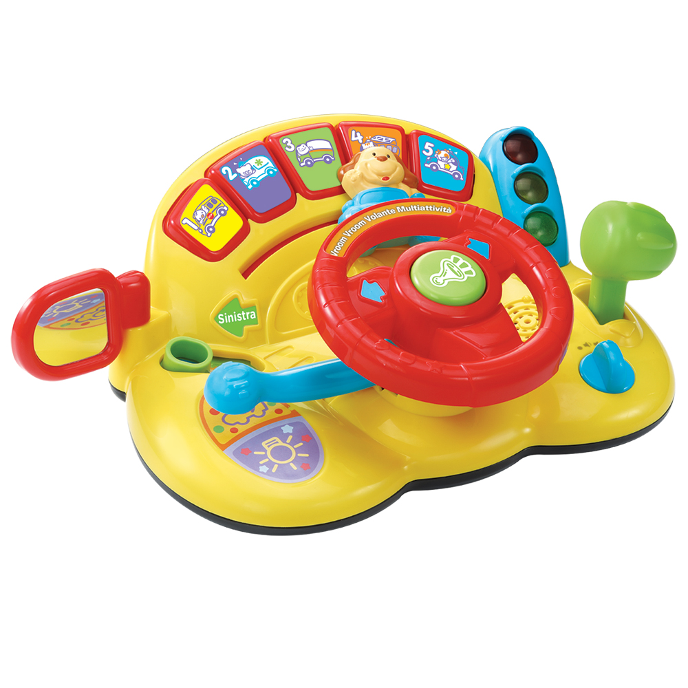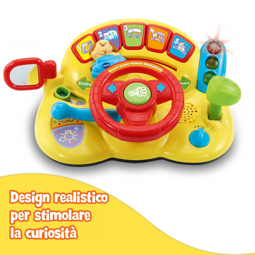 Vroom Vroom volante multiattività è un cruscotto ricco di funzionalità pensato per stimolare la curiosità e la motricità del tuo bambino.