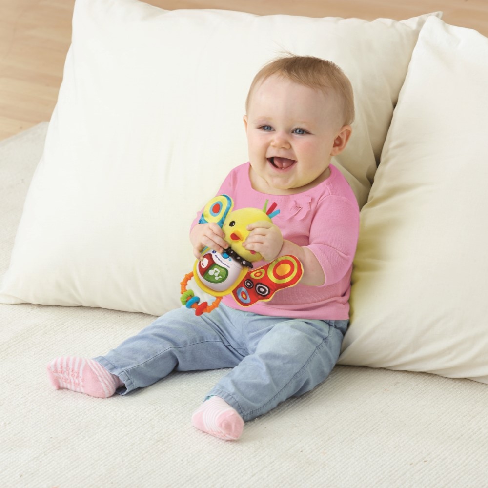 Un sonaglino parlante, musicale, luminoso con un pulcino morbidissimo che contribuisce allo sviluppo delle capacità motorie e del linguaggio del tuo bambino!